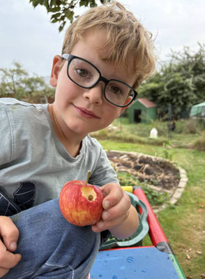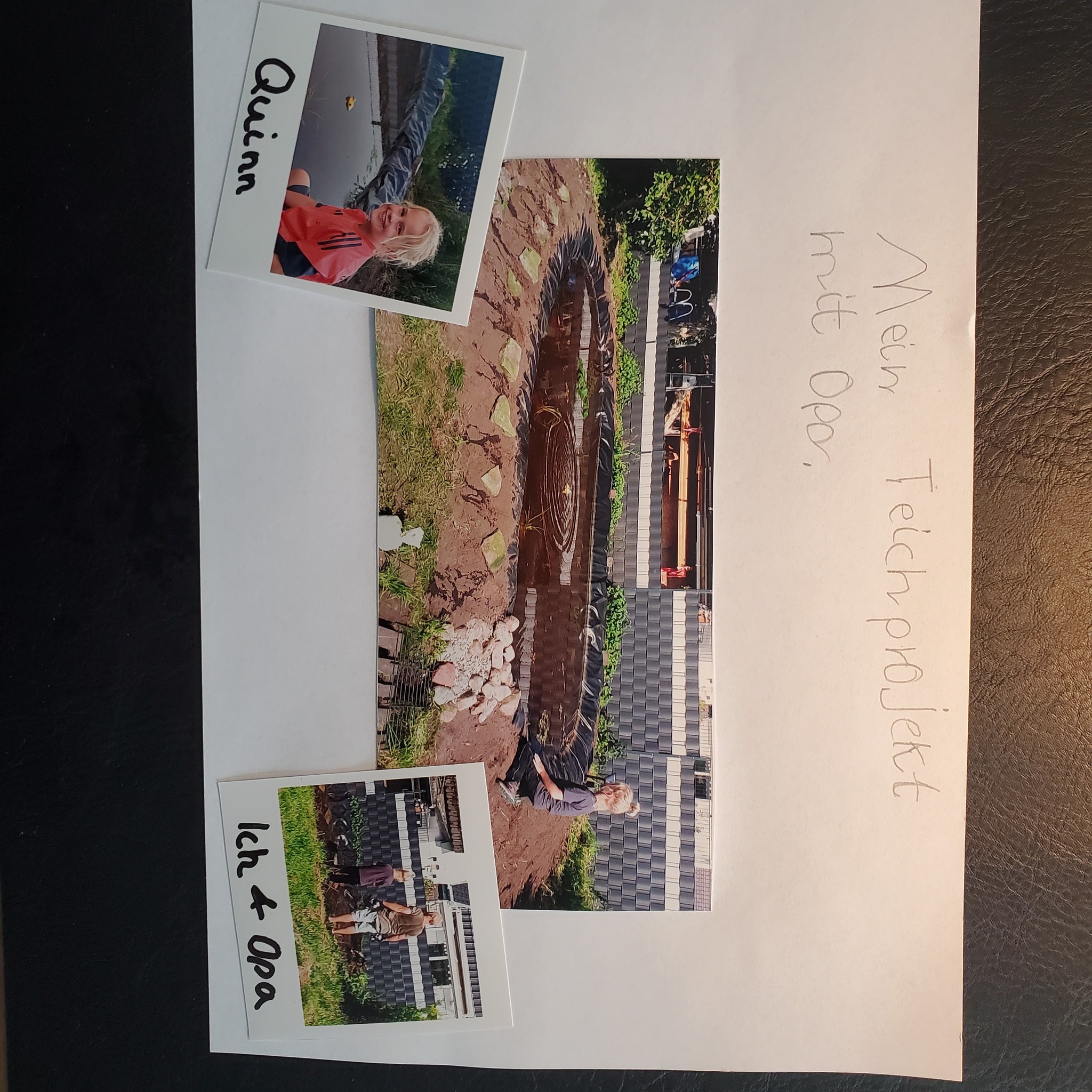 Quinn (7) aus der 2. Klasse hat sich mit einem ganz besonderen Projekt beworben: Gemeinsam mit seinem Opa hat er den Traum vom eigenen Teich verwirklicht. Von Hand wurde ein großes Loch mit verschiedenen Ebenen gegraben, eine Teichfolie ausgelegt, Wasser eingelassen und liebevoll bepflanzt – natürlich mit vielen Pausen bei Oma und jeder Menge Spaß!